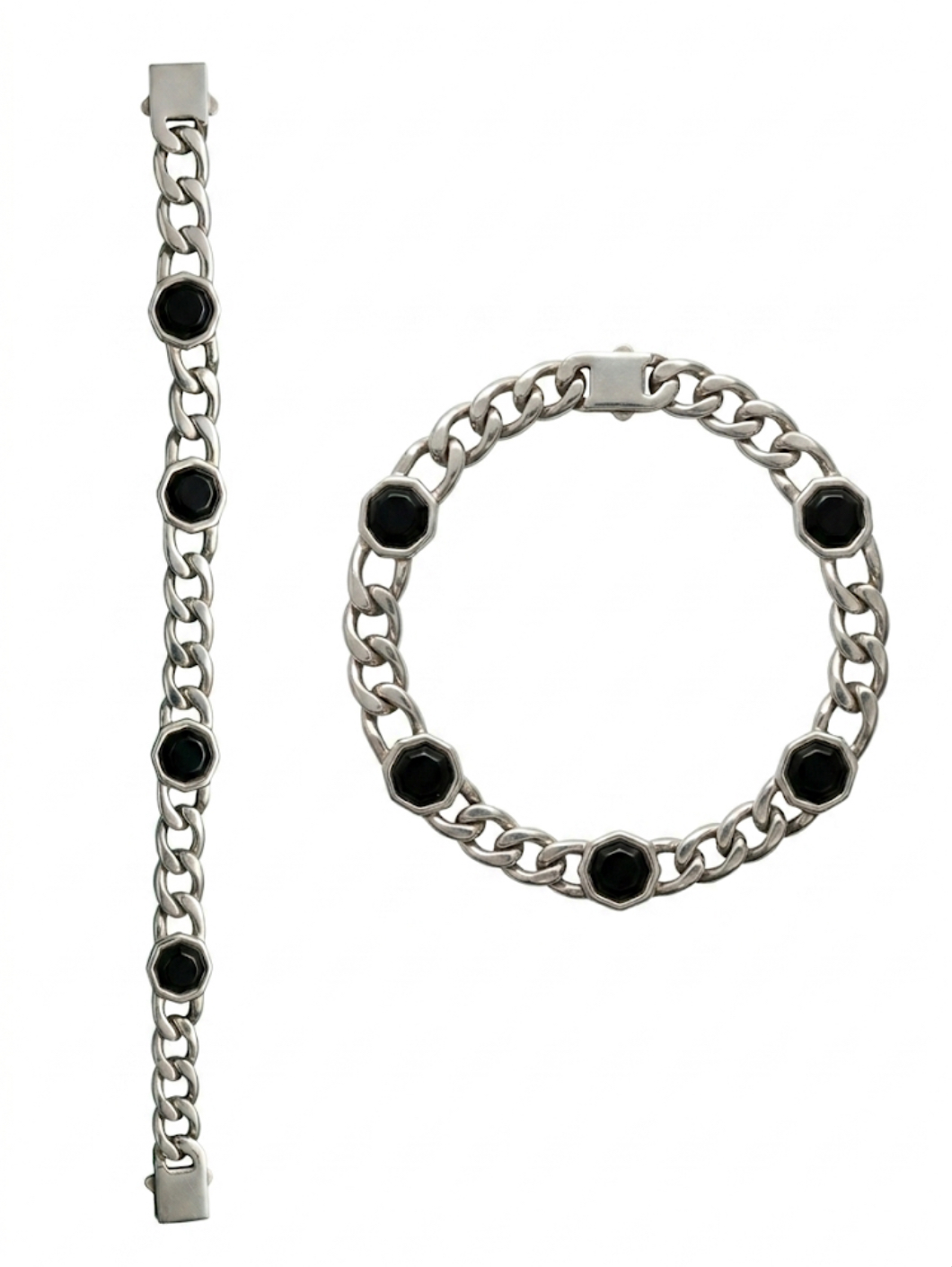 Eleva il tuo stile con un accessorio che fonde la forza dell’acciaio con l’eleganza misteriosa della pietra naturale. Questo bracciale a catena groumette è caratterizzato da esclusivi inserti esagonali in Onice Nera, incastonati artigianalmente per creare un contrasto cromatico deciso e sofisticato.